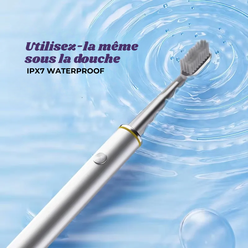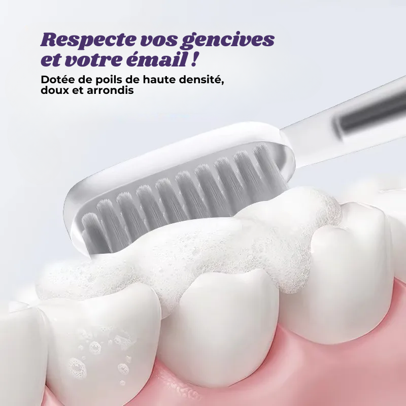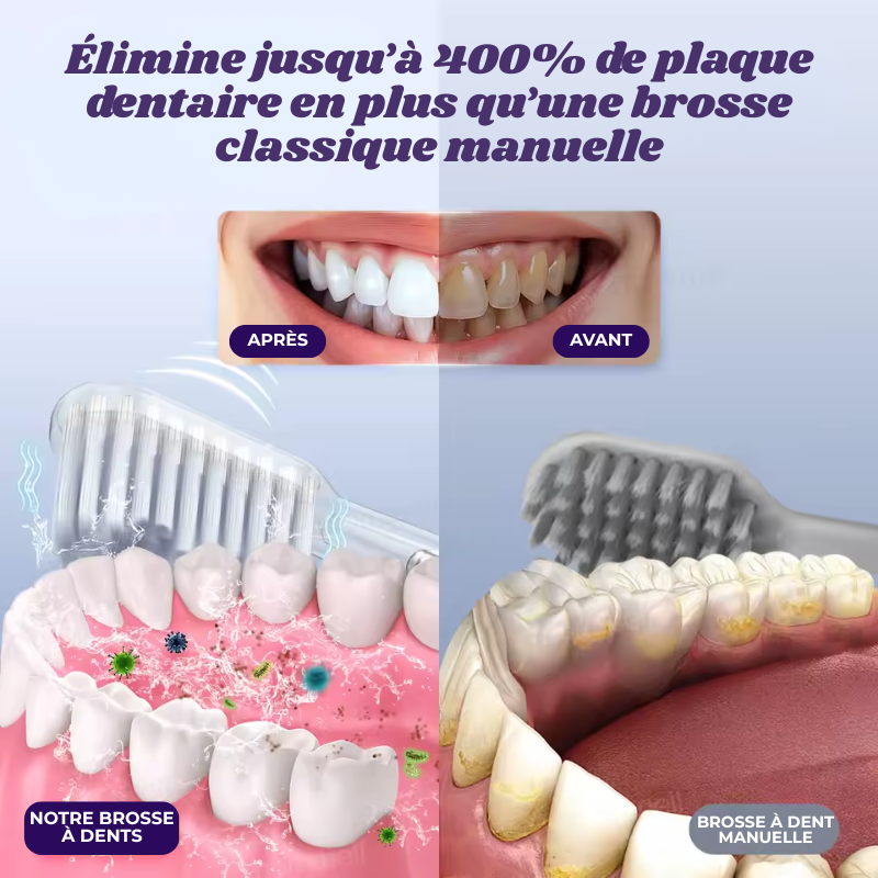 Pensée pour un usage pratique, cette brosse à dents est 100% waterproof (IPX7), vous pouvez donc l’utiliser même sous la douche. Elle est équipée d’une minuterie intelligente de 2 minutes avec rappel toutes les 30 secondes, vous guidant pour nettoyer chaque zone de la bouche de manière uniforme. Les poils de haute densité, doux et arrondis, garantissent un nettoyage efficace tout en respectant vos gencives et votre émail. De plus, elle élimine jusqu’à 400% de plaque dentaire en plus qu’une brosse classique manuelle, pour une bouche plus saine et protégée.