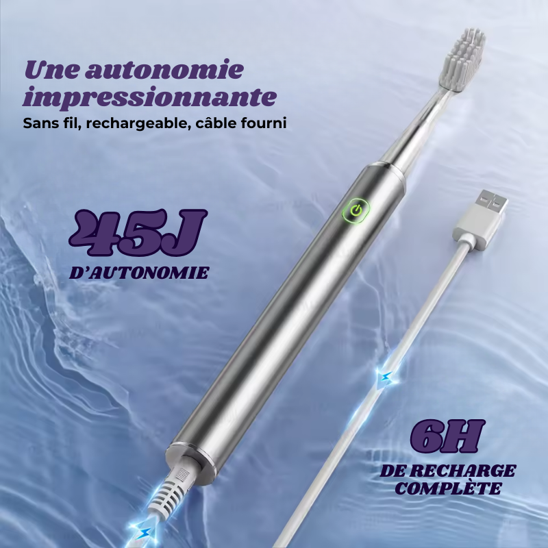 Rechargeable en seulement 6 heures, cette brosse offre une autonomie impressionnante de 45 jours. Ultra légère (seulement 50g), elle tient parfaitement en main et se glisse facilement dans une trousse de toilette pour vous accompagner en voyage. Avec ses 4 têtes de rechange incluses, vous êtes assuré d’une hygiène longue durée sans achats supplémentaires immédiats. Disponible en violet élégant ou argenté moderne, elle combine efficacité et style pour transformer votre routine bucco-dentaire en un vrai moment de bien-être.