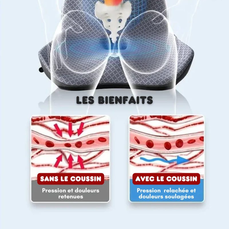 Ce coussin orthopédique révolutionnaire adopte un design 3D ergonomique qui protège votre colonne vertébrale tout en encourageant une posture correcte. Sa conception prévient les douleurs lombaires et réduit efficacement la pression sur le coccyx et les hanches.