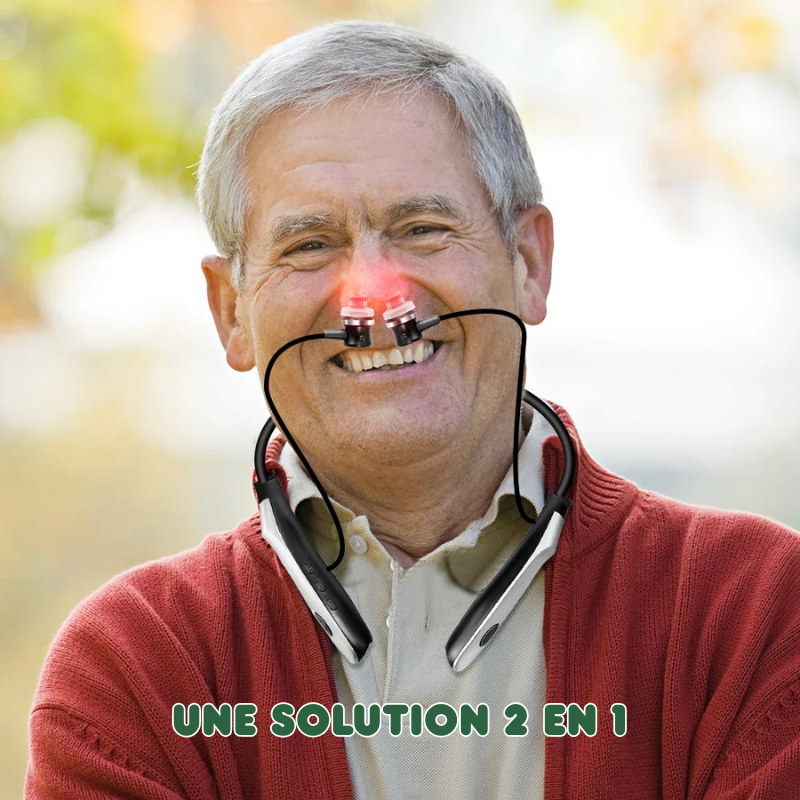 En plus du traitement auditif, l’appareil est livré avec trois paires d’embouts en silicone : deux pour les oreilles de tailles différentes, et une spécialement conçue pour un usage nasal. Grâce à cette fonction supplémentaire, vous pouvez traiter rapidement les problèmes de nez bouché, rhume, rhinite allergique ou sinusite. La lumière infrarouge, appliquée au niveau des narines, permet de décongestionner les voies respiratoires, de stopper l’écoulement nasal, les éternuements et de soulager les yeux larmoyants ou les maux de tête. C’est un appareil multifonction pensé pour votre confort global.
