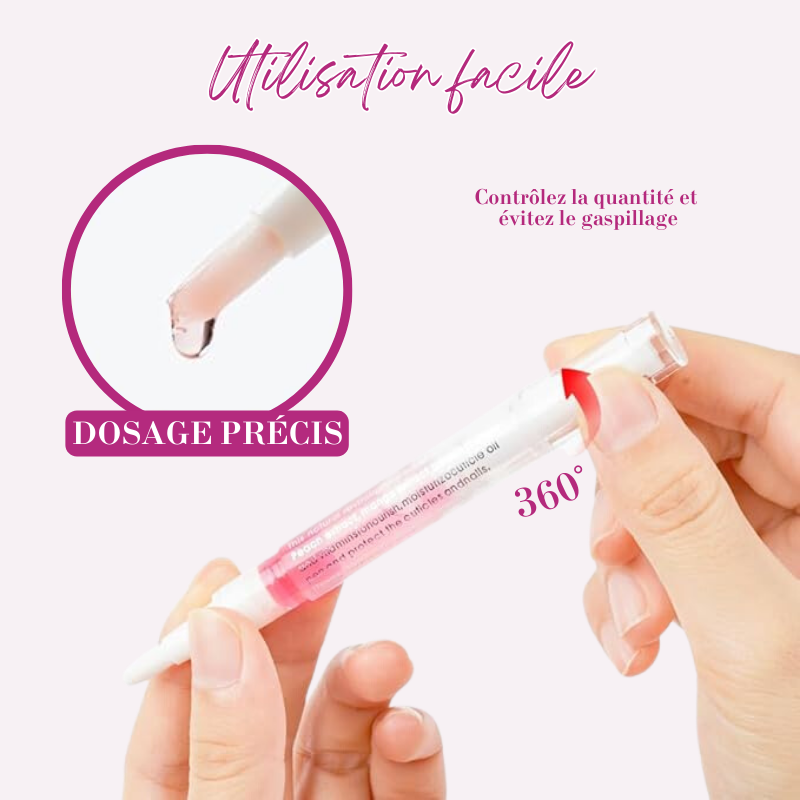 Grâce à leur design pratique, ces stylos délivrent la dose idéale d’huile en un simple tour de molette. L’applicateur précis dépose le produit directement sur les cuticules et les ongles, simplifiant l’utilisation où que vous soyez. Un massage doux permet une absorption rapide et optimale. À appliquer 3 à 4 fois par semaine pour des résultats visibles.