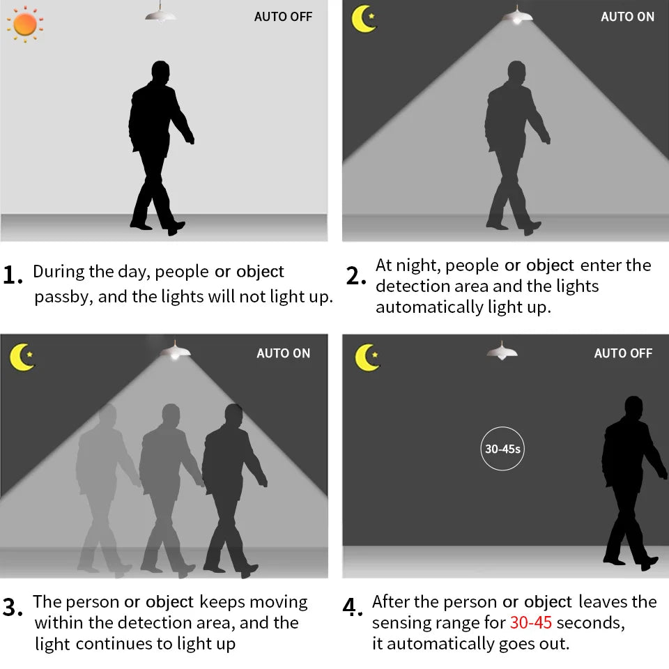 Équipé d'un **capteur de mouvement** de haute précision, ce produit garantit que votre **espace reste éclairé** tant que vous y êtes activement présent. Une fois que vous quittez la zone, les lumières s'éteignent après **30 à 45 secondes** pour optimiser l'économie d'énergie.