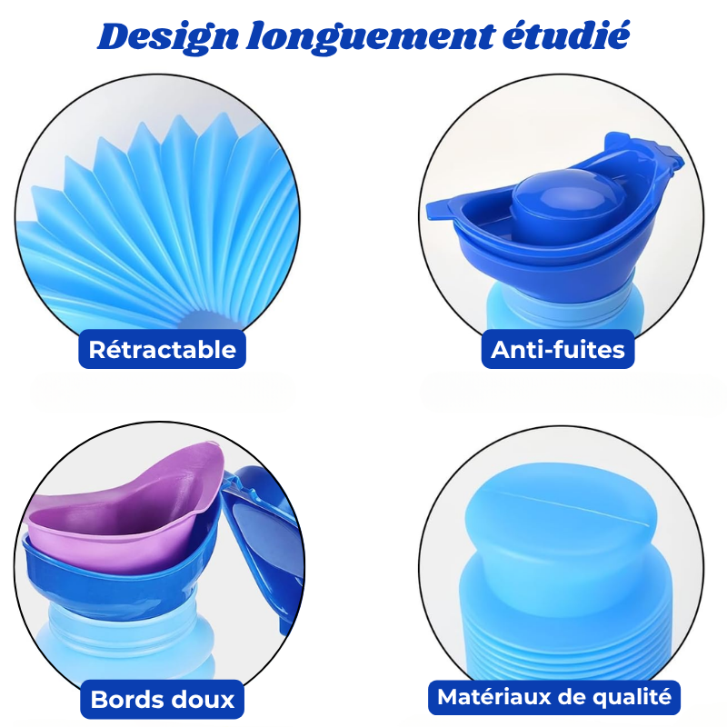 Grâce à son design accordéon rétractable, cet urinoir se plie complètement pour tenir dans un sac à dos, une poche ou une boîte à gants. Avec une capacité généreuse de 750 ml, il est parfaitement adapté aux adultes comme aux enfants.